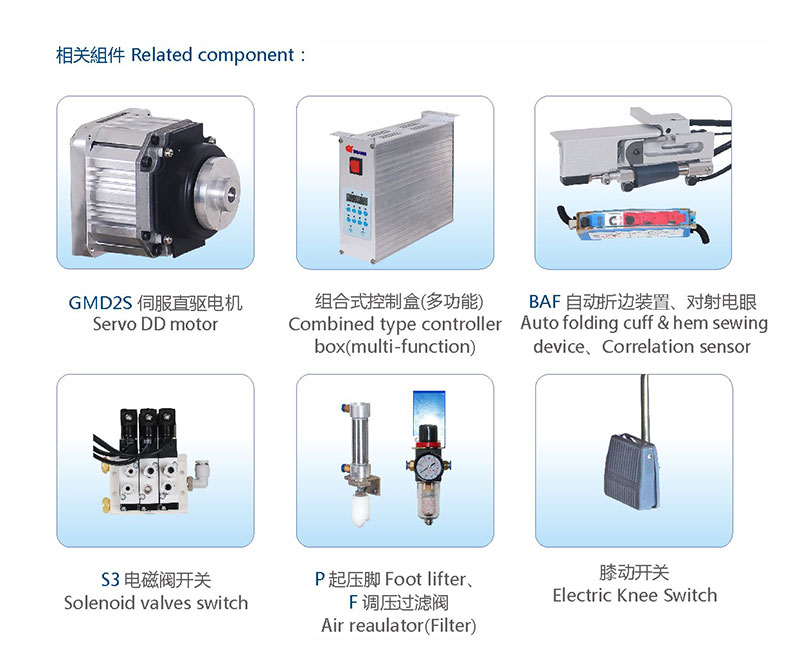 BAF 自动折缝闭合式袖口、下摆装置(适用于各种繃缝机,高度自动化设备,本图以配飞马W600绷缝机为例):